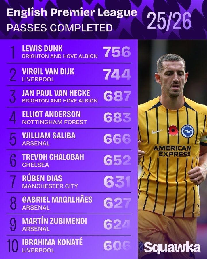 本赛季英超奏凯传球榜:范戴克第二,中场仅安德森、苏维门迪