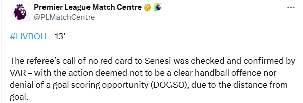 08月16日讯 利物浦vs伯恩茅斯第14分钟,利物浦反击,塞内西手球看成未判引争议。英超官方给出了发挥。