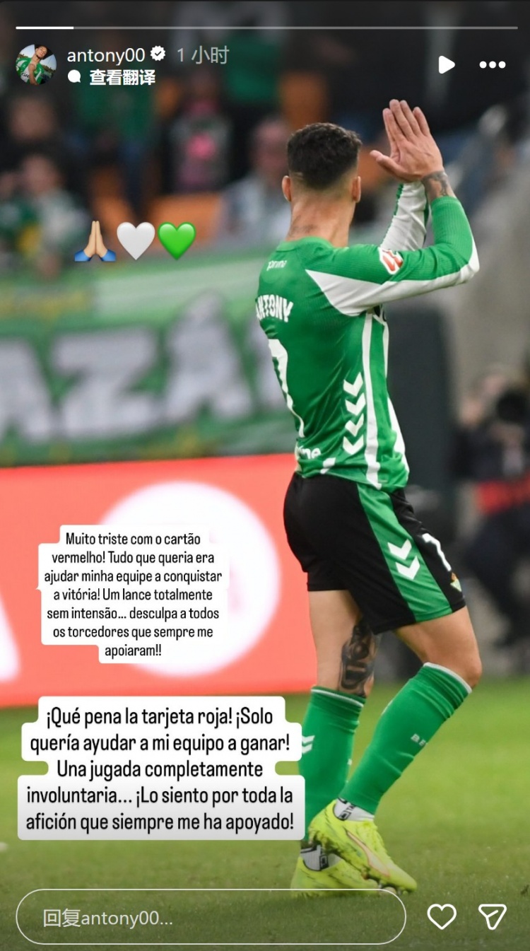 安东尼在外交媒体上写谈:“很缺憾吃到红牌,我仅仅思帮球队赢球,满盈是不测的行为…… 很对不起让一直赈济我的球迷们失望了。”