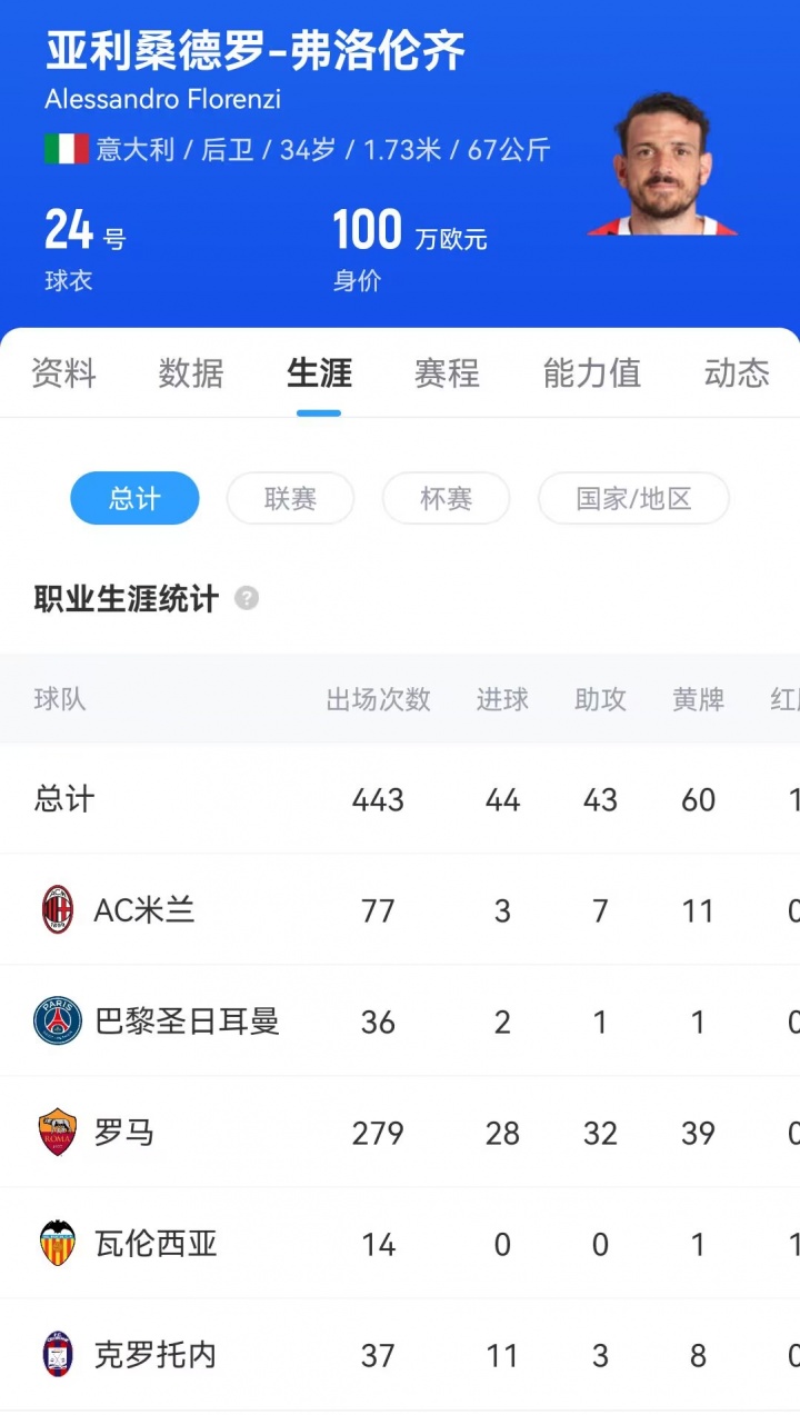 弗洛伦都现年34岁,出谈自罗马青训,曾服从于罗马、巴黎圣日耳曼、AC米兰等队。球员代表罗马认为出场279次,孝顺28球32助。片晌服从巴黎技巧,球员得回了法国杯冠军以及法国超等杯冠军。