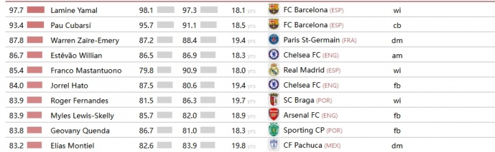 中国占3东谈主!寰球最强U20:亚马尔第1,王钰栋第54,李新翔第158