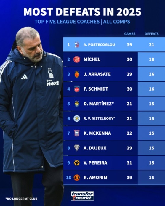 2025年五大联赛主证据输球场次排名:澳波21场居首,阿莫林15场