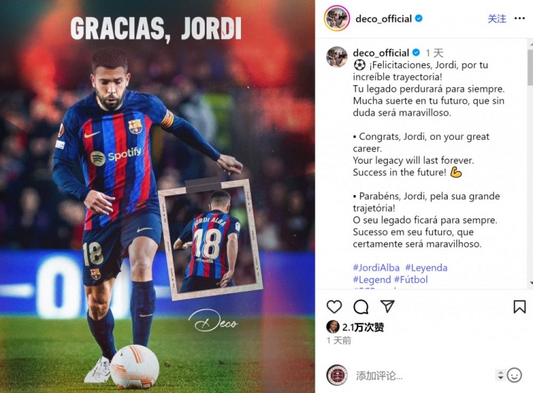 德科社媒晒出感谢阿尔巴的海报,配文:“恭喜,约迪,你渡过了精彩的办事糊口。你的‘足球遗产’将永存,祝将来取班师利!”