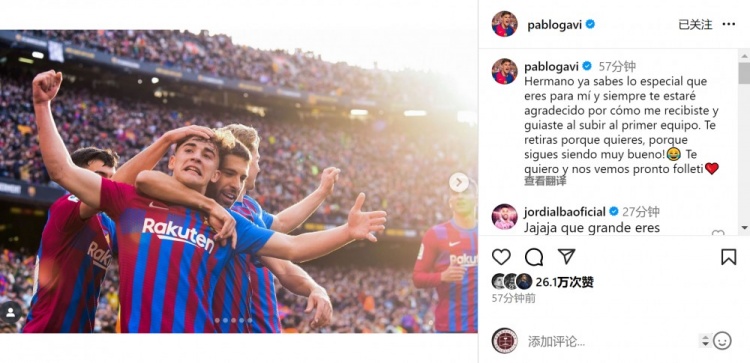 10月9日讯 阿尔巴晓谕将在本赛季戒指后退役,巴萨中场加维社媒发文请安。
