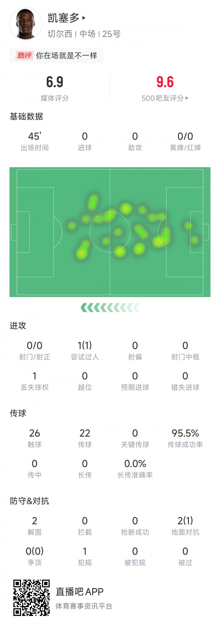 23岁的凯塞多半场26次触球,仅1次丢球权,传球成功率95.5%稳住了切尔西的中场。此外他还有2次突围和1次过东说念主。