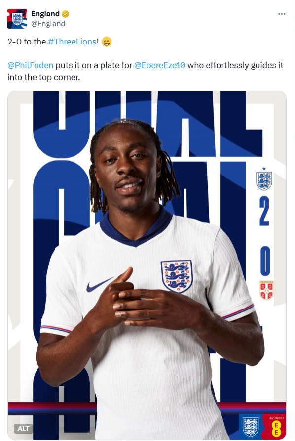 英格兰2-0打败塞尔维亚,埃泽在第90分钟破门锁定胜局,英格兰队官方的进球描述却激勉了一众英国球迷的吐槽。