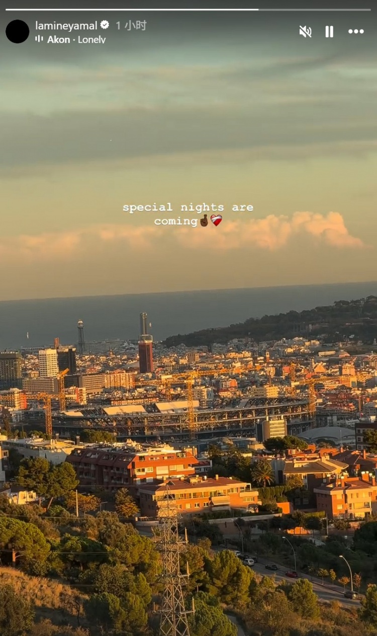 亚马尔社媒晒夕阳下的诺坎普球场:一个稀奇的夜晚行将到来