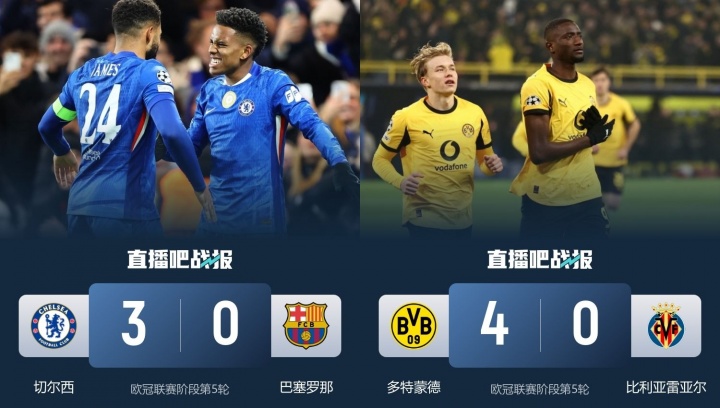 巴萨客场0-3不敌切尔西,比利亚雷亚尔客场0-4不敌多特蒙德,毕尔巴鄂竞技客场0-0战平弱旅布拉格斯拉维亚。