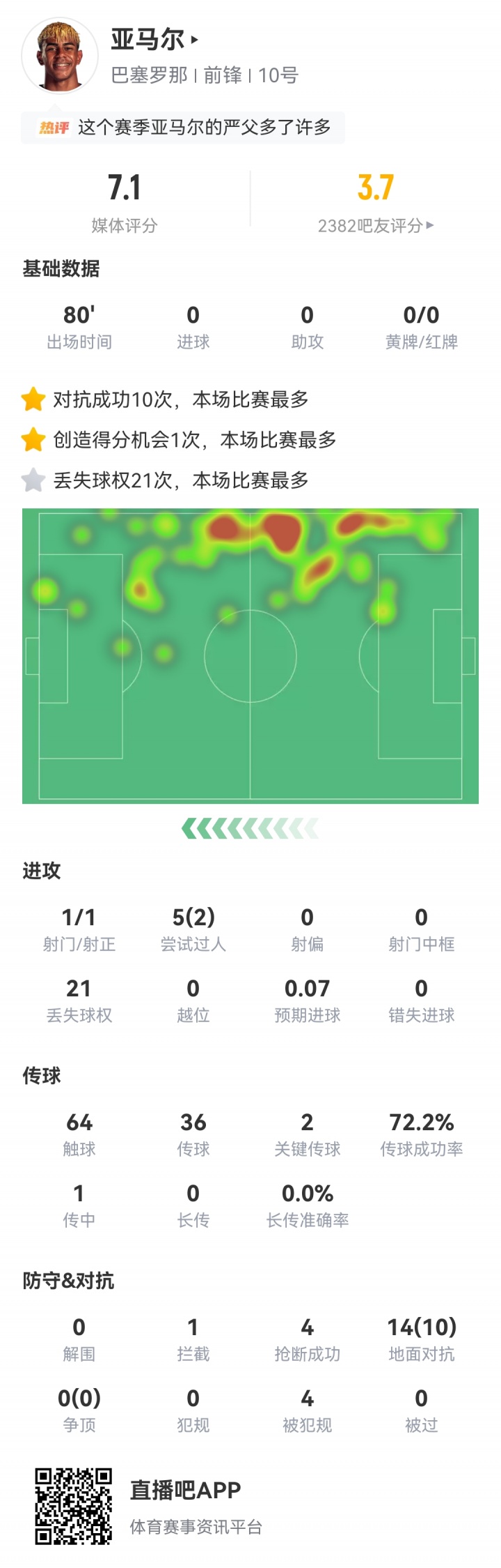 本场比赛亚马尔遭到了国度队队友库库雷利亚的防备效力,全场樗栎庸材,仅完成了1次射门,64次触球21次丢失球权,36次传球得胜率72.2%,在第80分钟被换下场。