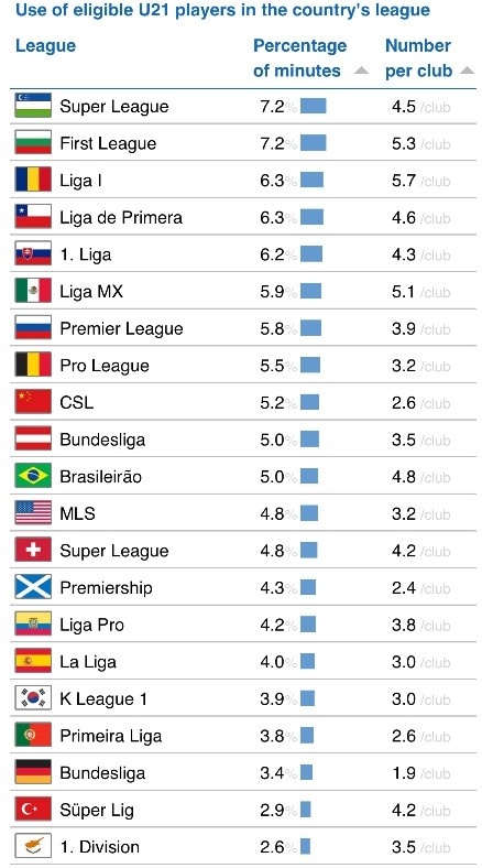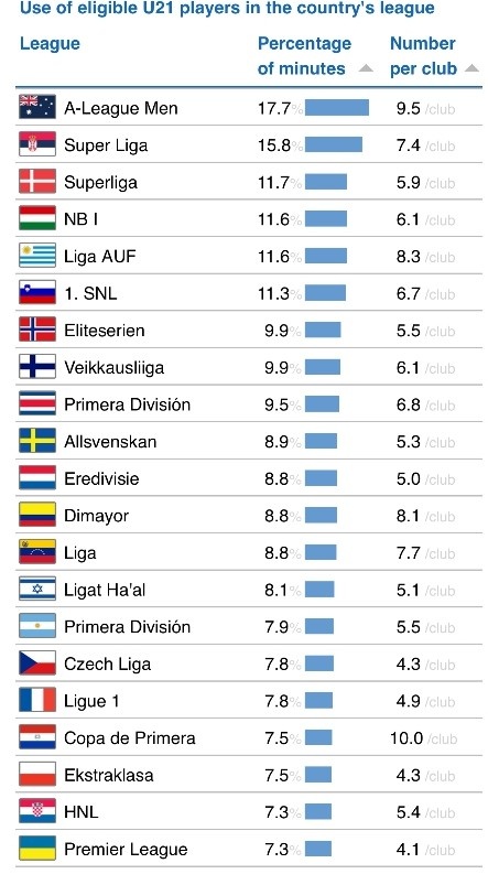 U21球员出场技艺占比17.7%的澳超联赛,在本次排行中位居首位。塞尔维亚超等联赛(15.8%)和丹麦超等联赛(11.7%)紧随后来,排行二三位。