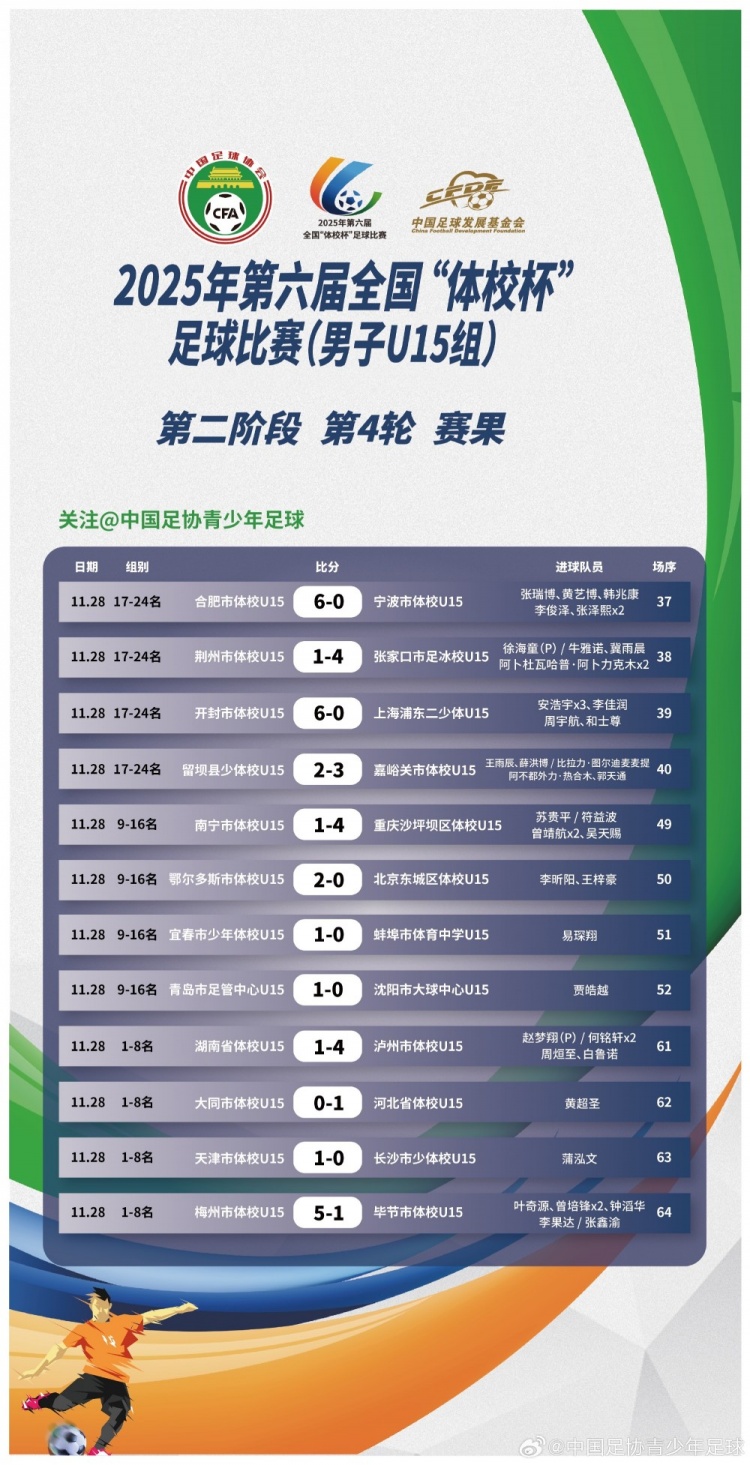 【泸州市体校U15、河北省体校U15、天津市体校U15、梅州市体校U15晋级四强】2025年第六届世界“体校杯”足球比赛(男人U15组)第二阶段第4轮赛果