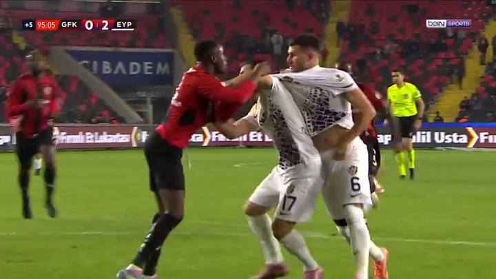 本场比赛伤停补时终末本事出现卓越离谱的一幕,两队球员在禁区内发生突破,随后突破升级多东说念主参与劝架。然则裁判对此皆备莫得线路,比赛并未暂停,加济安泰普球员博阿滕此时打佛门到手。进球后裁判暗示中圈开球,突破随后渐渐罢手,裁判莫得作念出任何判罚,一张牌没出。