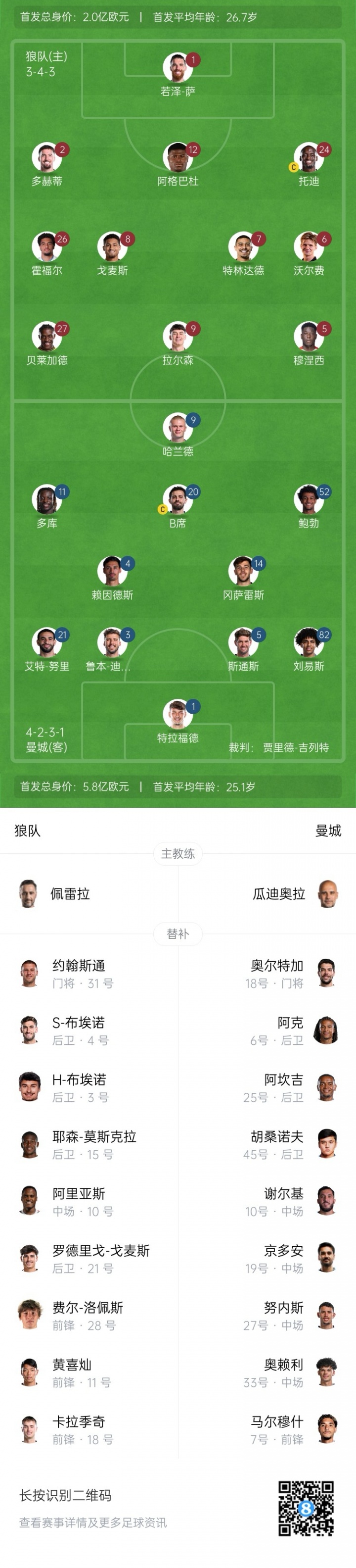 曼城首发:1-特拉福德、82-刘易斯、5-斯通斯、3-迪亚斯、21-努里、14-尼科-冈萨雷斯、20-B席、52-鲍勃、4-赖因德斯、11-多库、9-哈兰德