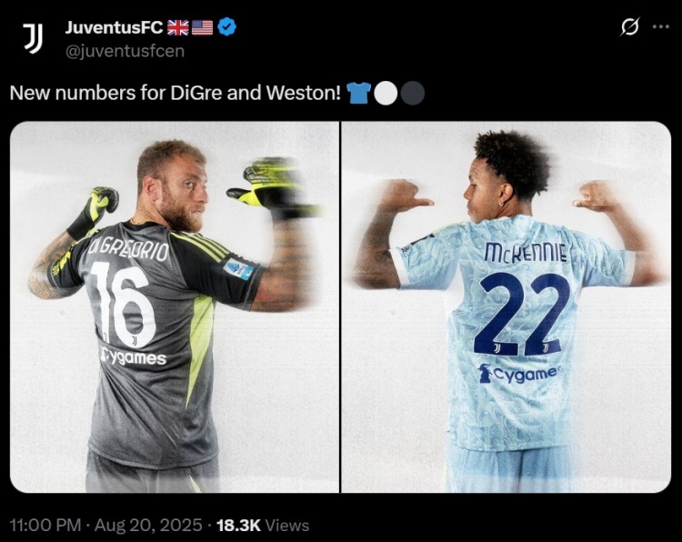 8月21日讯 尤文臣宣,迪格雷戈里奥以及麦肯尼更换号码。