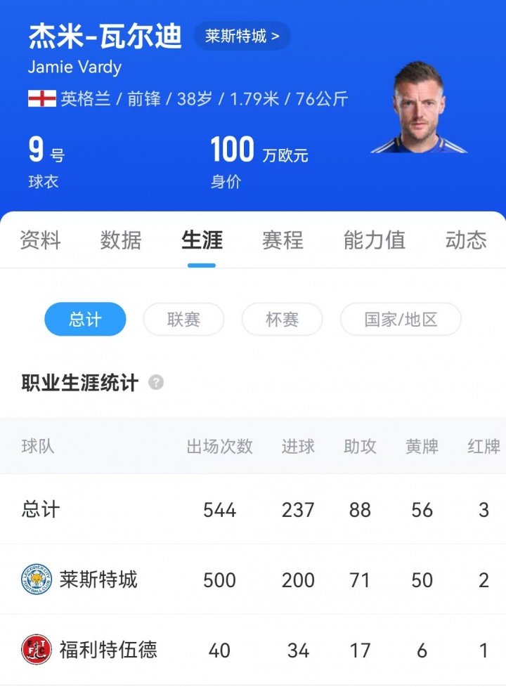 现年38岁的瓦尔迪将办事糊口绝大部分时辰齐献给了莱斯特城,共为莱斯了得场500次,孝顺200球71助攻;并匡助球队取得15-16赛季的英超冠军等荣誉。本年夏天,瓦尔迪与莱斯特城的合同到期,成为解放球员。
