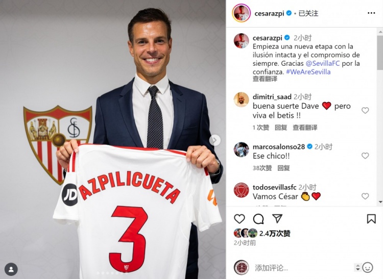 阿斯皮利奎塔解放身加盟塞维利亚,他在外交媒体上晒出展示球衣的像片,并写说念:“怀揣着不变的情切与一如既往的愉快,开启新鲜征途。感谢塞维利亚的信任。”