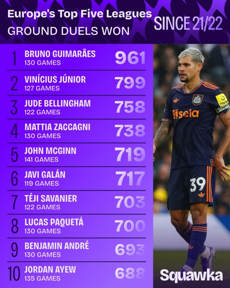 9月11日讯 Squawka统计了2021-2022赛季以来球员在五大联赛大地抗拒得手的次数,并排出榜单,吉马良斯961次居首,维尼修斯、贝林厄姆二三位。