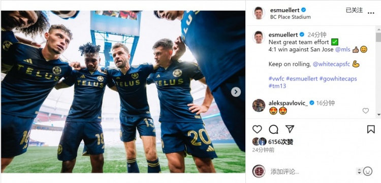 穆勒社媒晒出与队友的合照,配文:“又一场出色的团队推崇,4-1打败圣何塞。链接前进,温哥华白浪!”