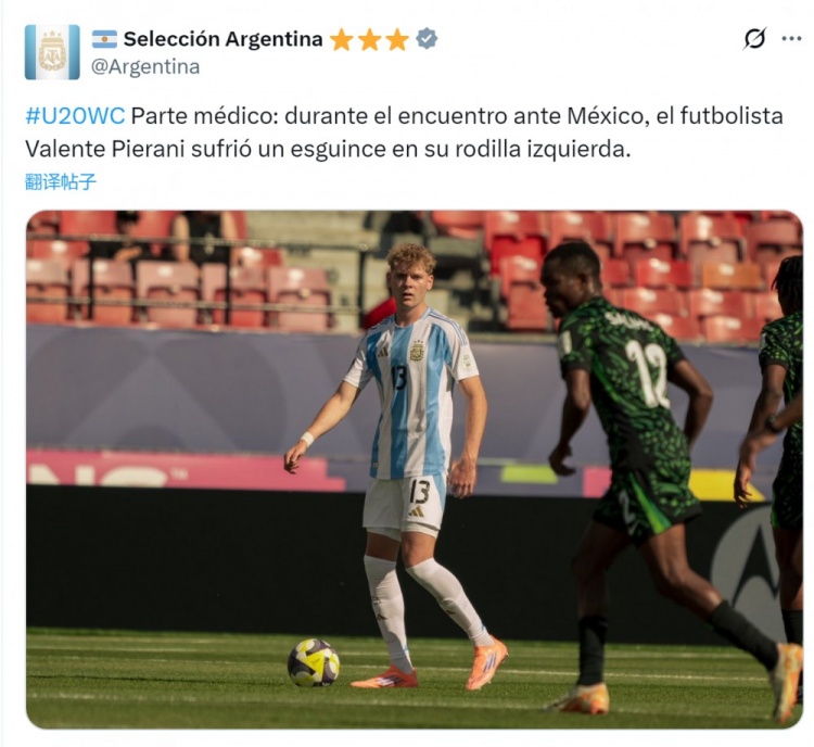 官方:阿根廷U20主力中卫皮埃拉尼左膝扭伤,此前邻接4场首发