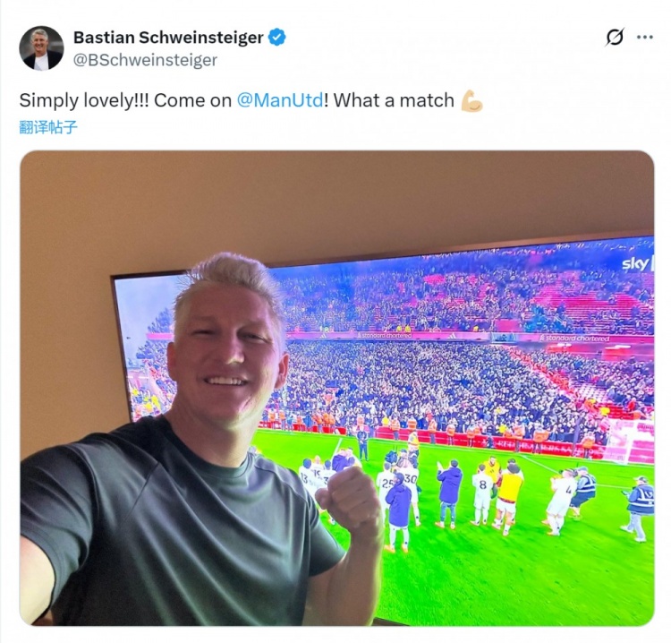 曼联旧将、德国足坛名宿施魏因斯泰格通过电视不雅看双红会,赛后他晒出我方在电视机前的像片,配文:“几乎太隐秘了!加油曼联,何等精彩的比赛!”