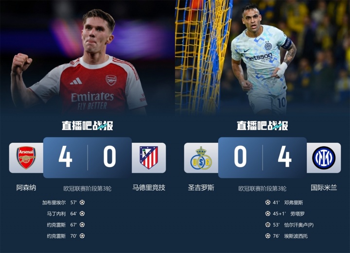 10月22日讯 欧冠第三轮首个比赛日,巴黎7-2狂胜药厂,巴萨6-1暴打奥林匹亚科斯,阿森纳4-0横扫马竞,国米4-0横扫圣吉罗斯。