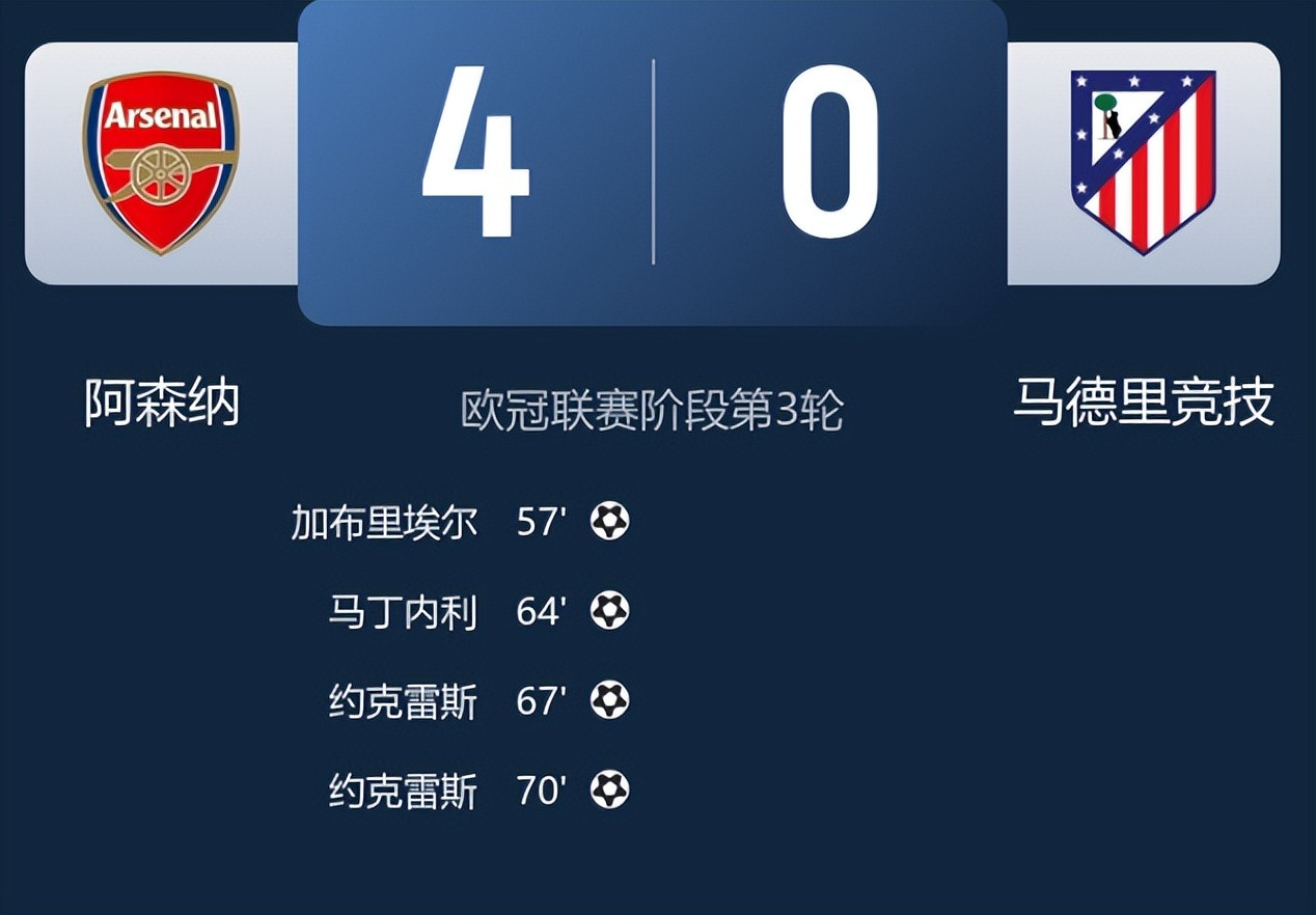 阿森纳镇守酋长球场迎战马竞。上半场埃泽中横梁,萨卡失单刀,拉亚出击突围的确矗立,阿森纳暂0-0马竞;下半场赖斯任性球助攻加布里埃尔破门,马丁内利接斯凯利一条龙助攻再下一城,约克雷斯双响锁定胜局,最终阿森纳4-0马竞,欧冠三连胜。