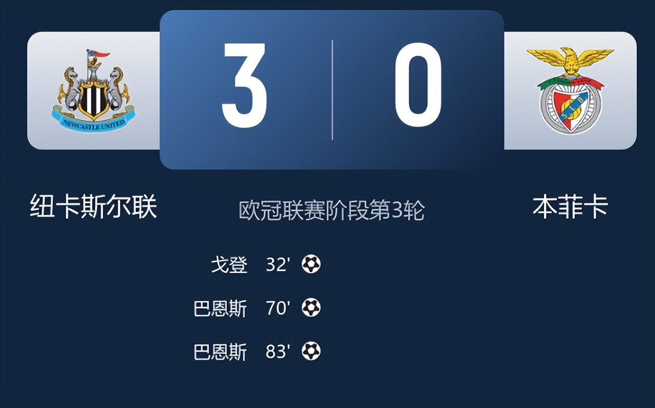 纽卡主场迎战本菲卡,上半场特鲁宾屡献精彩扑救,卢克巴基奥中柱,墨菲助攻戈登推射首开纪录,主队占尽上风只是1-0普及,下半场波普手抛球助攻巴恩斯单刀抽射扩大比分,戈登助攻巴恩斯破门完成双响,最终纽卡3-0本菲卡得益欧冠两连胜,本菲卡欧冠三连败。