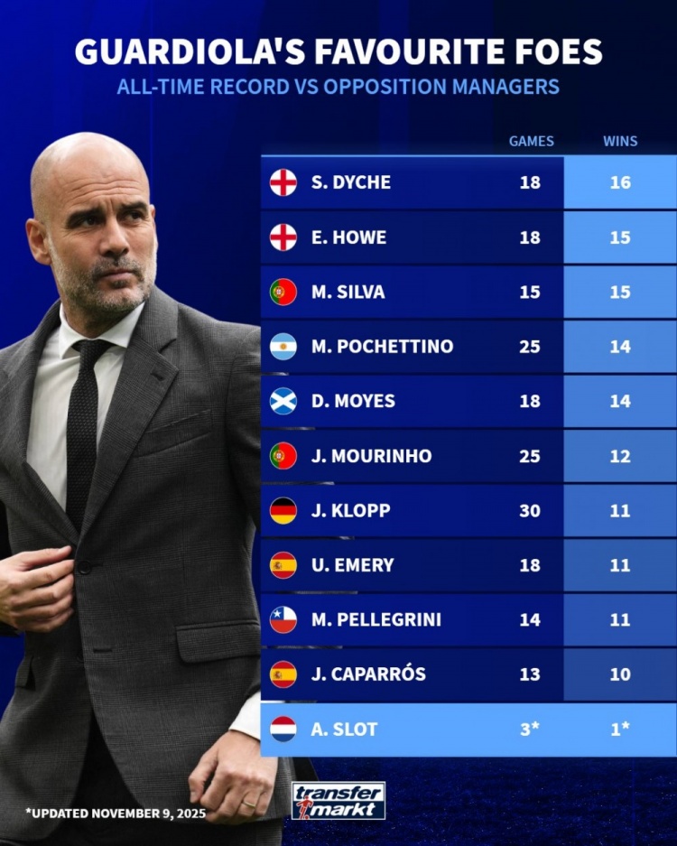 11月10日讯 曼城在本轮英超焦点战3-0完生效物浦,瓜帅也得回了捏教糊口对阵斯洛特的首胜。《转会市集》也列出了瓜帅捏教糊口对阵发挥注解的胜场最多榜。