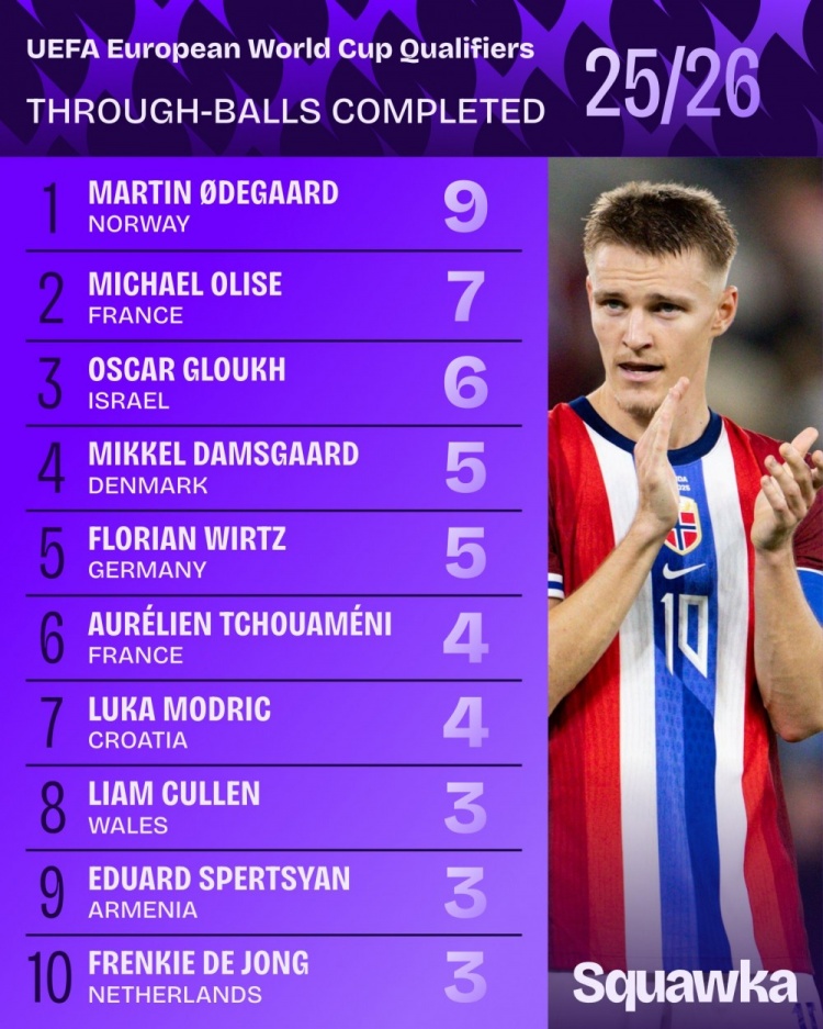 11月20日讯 本届世欧预小组赛也曾告一段落,squakwa也统计了本届赛事直塞情况,厄德高领跑。