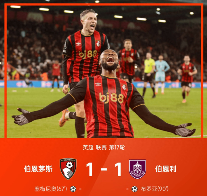 下半场比赛,第51分钟,又是布鲁克斯!伯恩茅斯再掀攻势,但此次头球超越横梁,第67分钟,伯恩利禁区内劳伦特突围滑倒不实立正,塞梅尼奥胜仗一脚兜射破门!伯恩茅斯1-0当先伯恩利,第79分钟,就差小数!克鲁皮飞身铲射,可惜没能际遇皮球错过进球,第86分钟,终于完成初次敲门!布罗亚完成远射,但皮球被挡出,第90分钟,伯恩利计谋角球开出,皮球传中到禁区内,布罗亚头球绝平!伯恩利1-1伯恩茅斯,全场比赛箝制,两边打成平局,从数据看,伯恩茅斯控球率高达65%,全场13次射门,伯恩利全场只是2次射门,伏击颠倒低迷!