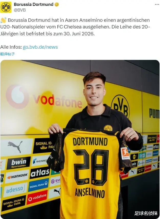 官方:多特蒙德告示从切尔西租出签下了安塞尔米诺。生意为单纯租出,不含买断要求。