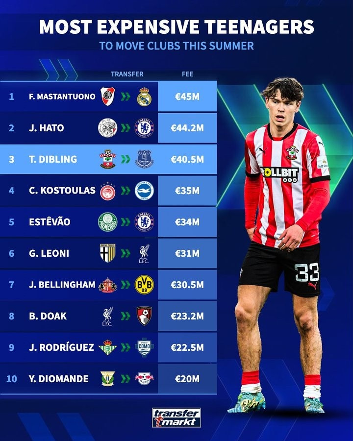 今夏U19球员转会费排行: 马斯坦托诺4500万欧居首