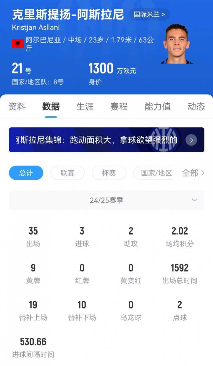 阿斯拉尼现年23岁,司职中场。国米在2023年以1570万签下阿斯拉尼,效用球队于今,阿斯拉尼出场99次,孝顺4球5助,当今球员德回身价为1300万欧元。