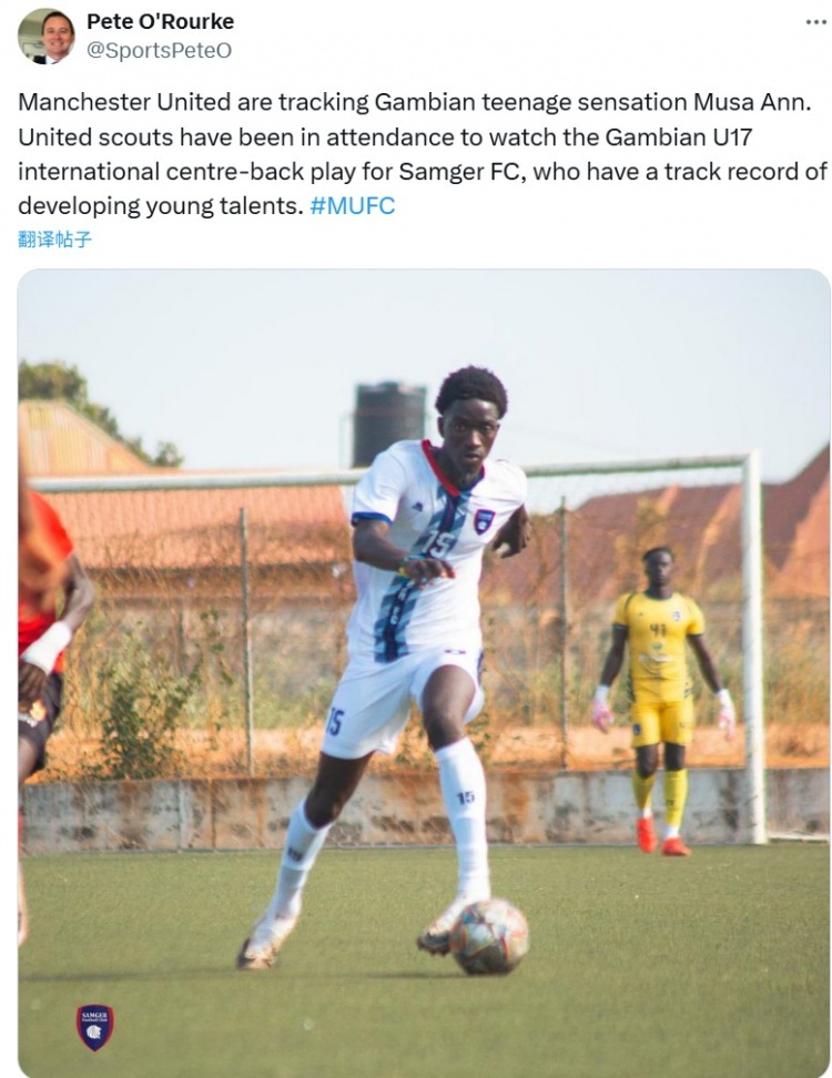 报谈称曼联球探在现场考试了这名冈比亚U17国脚中卫,该球员当今效率于以培养年青才俊著称的萨姆格尔足球俱乐部。