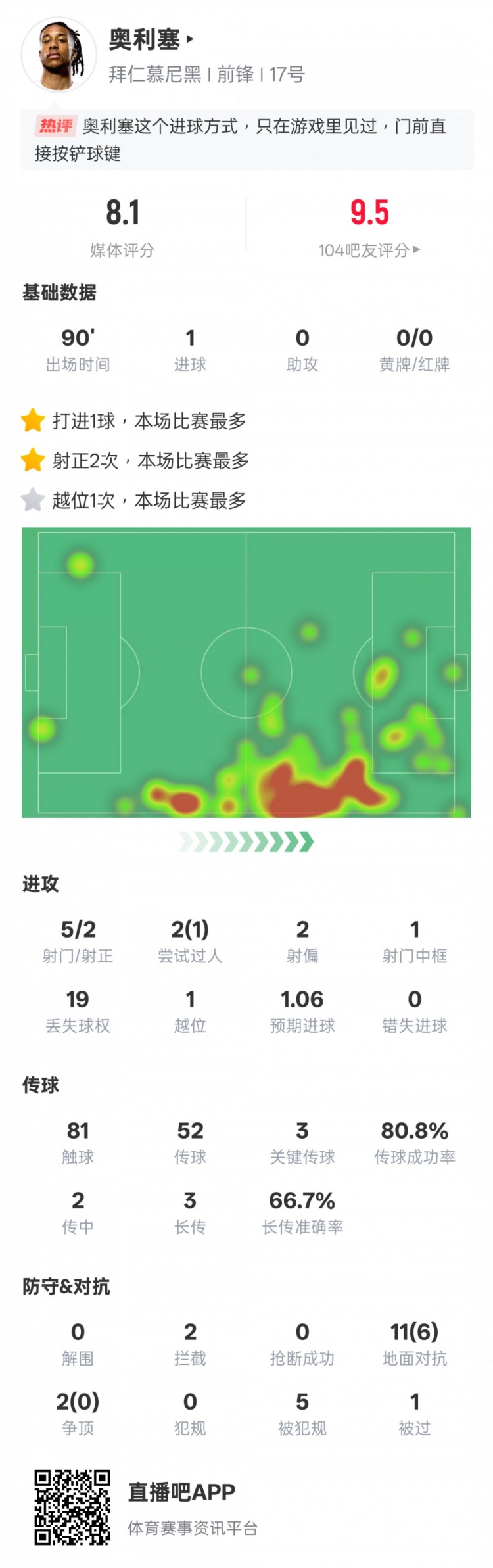 奥利塞本场数据:1进球3环节传球1过东谈主顺利,评分8.1