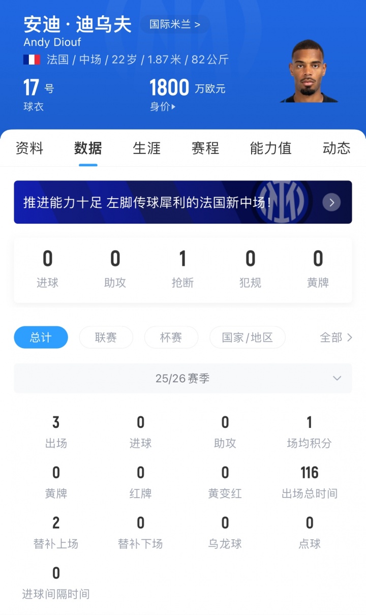 迪乌夫现年22岁,本赛季仅为国米出场3次,野心116分钟,莫得进球和助攻,他现身价1800万欧,与国米的条约相似在2030年到期。
