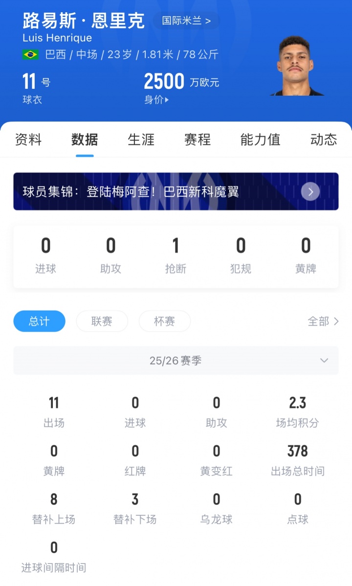 恩里克现年23岁,本赛季恩里克仅为国米登场11次野心378分钟,莫得进球和助攻,他现身价2500万欧,与国米的条约在2030年到期。