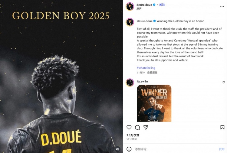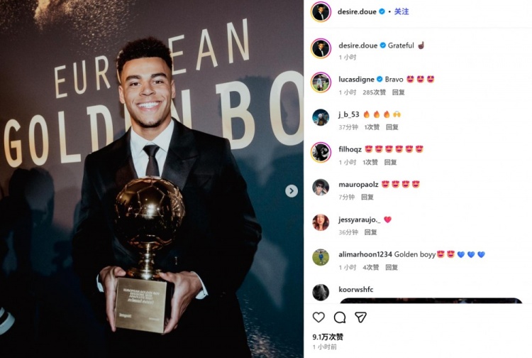 杜埃社媒牵记得到金童奖:感谢巴黎俱乐部陡立以及我的发蒙老师