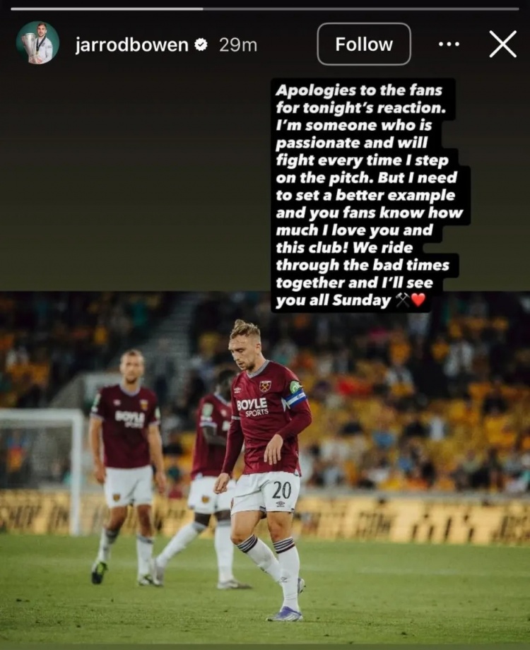 8月27日讯 今天凌晨,西汉姆在联赛杯2-3不敌狼队,赛后西汉姆队长鲍文与自家球迷爆发打破,但随后他在外交媒体发文说念歉。